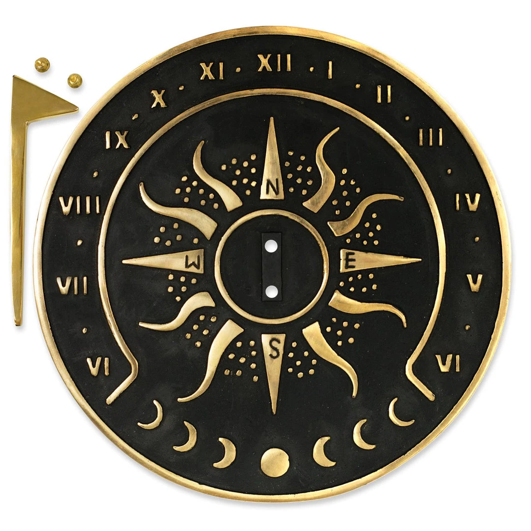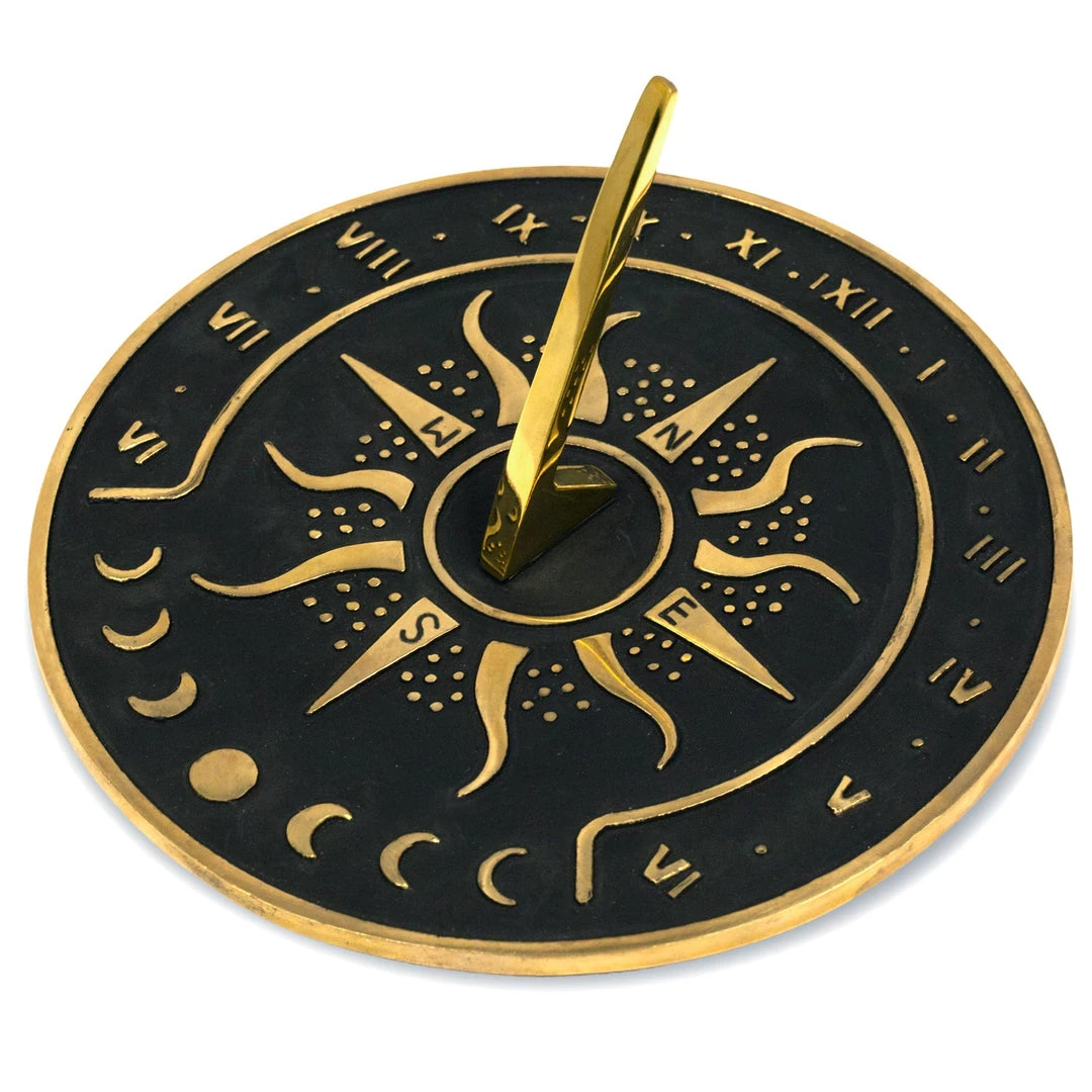 The Sunward sundial weighs 2.75 lbs and measures 8.5” in diameter with a 4” gnomon and non-slip rubber feet. Apart from the Roman numerals projections, the Sunward dial also features North, South, East, and West markings.
