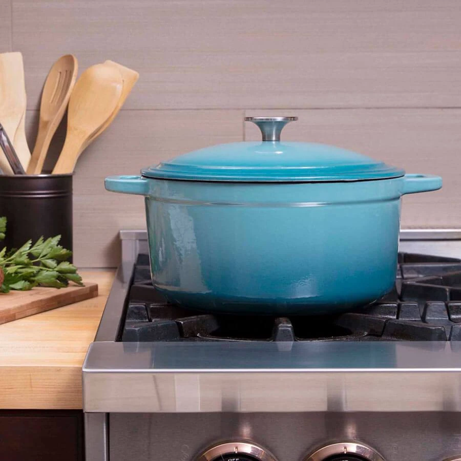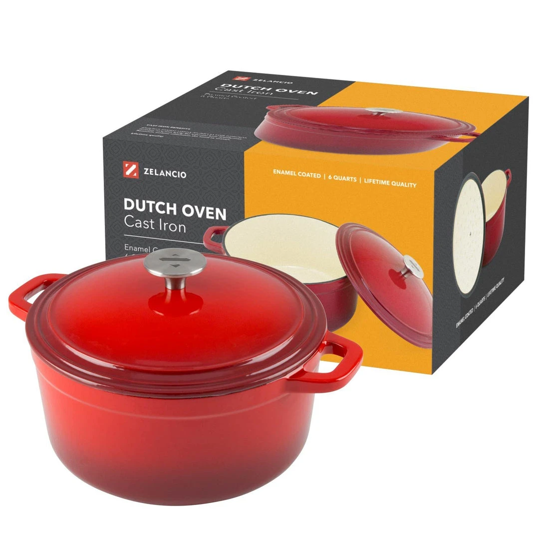 Big enough to cook for a crowd – beautiful enough for special meals. Zelancio enamel cast iron cookware is constructed of heavy-duty cast iron with a durable porcelain enamel finish. The cast iron provides superior heat distribution and retention and it’s oven and broiler safe up to 500-degrees Fahrenheit. Featuring three layers of chip-resistant porcelain enamel, the dutch oven has a cream-colored interior. The 6-quart size is great for roasting meats and preparing crowd-pleasing meals.