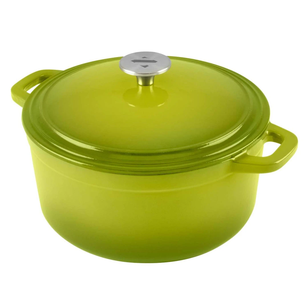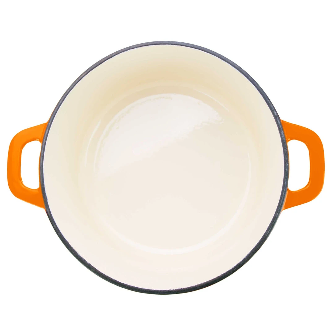 Cook and serve in the same dish; the vibrant, on-trend exterior colors look great on the stove or at the dining table. Solid, one-piece construction includes large loop handles so you can easily lift your cookware in and out of the oven. Â Available in orange, red, and teal, the color is deeper at the base and around the rim of the lid, giving this set a high-end, designer look. The included lid fits tightly to seal in moisture and heat, and features condensation bumps on the underside for self basting. The surface cleans up easily and requires no seasoning. Handwashing is recommended to keep your dutch oven looking like new for years to come.