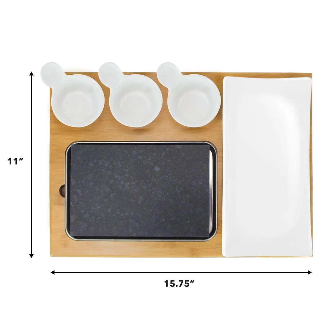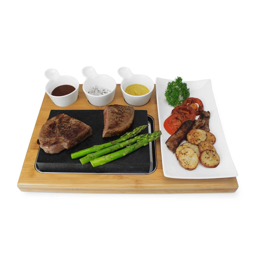 Memorable meals start with the presentation. Add a little drama to  your next dinner party and delight guests with restaurant-style flair when you sear meat, seafood or vegetables right at the table! At the heart of this impressive set is the five-pound lava stone. Sourced from Mount Etna in Sicily, Italy, the 100% food-grade basaltic rock has unique, natural properties that provide superior heat retention and distribution. Just heat the stone on the grill or in the oven, then transfer it to the beautiful bamboo presentation tray.  The set includes a durable, easy-to-clean lava stone, stainless steel liner to place beneath the stone, a bamboo presentation tray, three ceramic ramekins for dipping sauces or condiments, and a ceramic platter for garnishes. The stone can also be frozen for sushi and other cold dishes. To create a decadent dessert, use the cold stone to mix crushed candies and other sweets into homemade ice cream. For a truly unique, interactive dining experience, buy a set for each guest so they can join in the fun.
